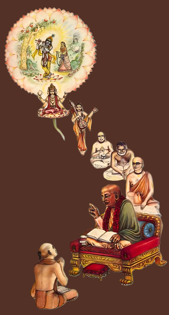 A visual representation of the 32 Acharyas in the Brahma-Madhva-Gaudiya Sampradaya starting from Lord Sri Krishna.